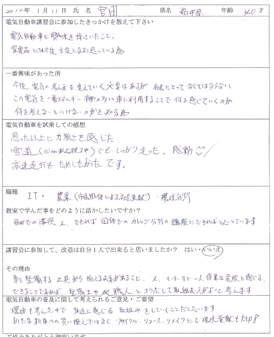 | 電気自動車に興味があり、調べていたらネットで見かけたので、参加を決めた。 |